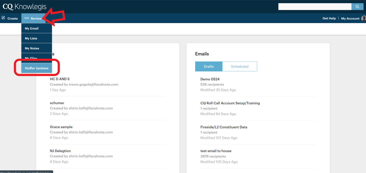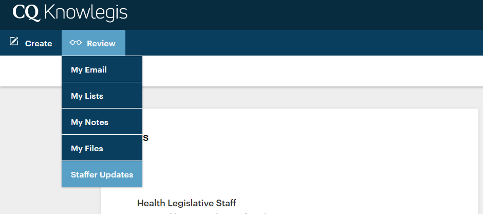 Once you are done submitting your update request, you will receive a notification from our CQ support team when the changes have been completed, or you may log in to your Knowlegis account, click the "Review" tab, then select "Staffer Updates."
